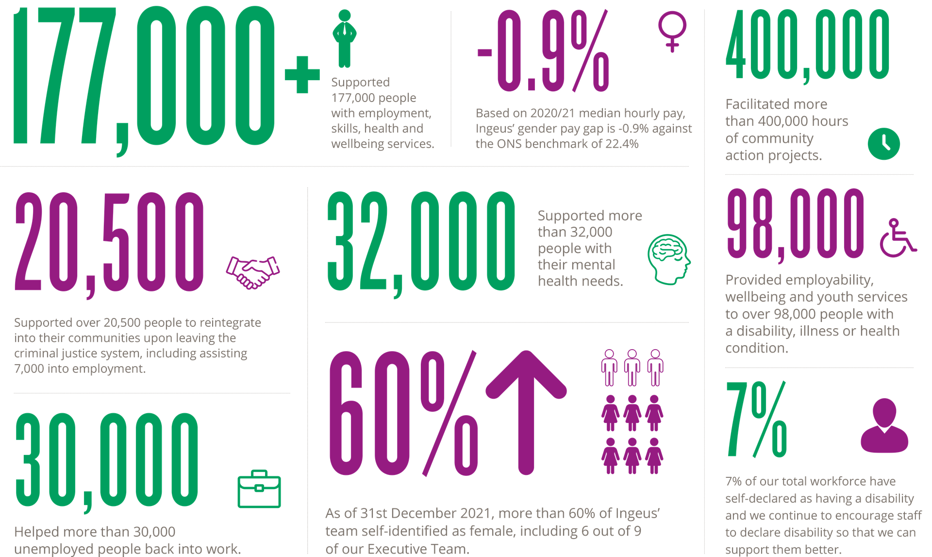 Ingeus provides services for people, businesses and communities to create and improve employment, skills, health and wellbeing and we strive to deliver social impact through maximising the impact of our core services, as well as delivering social value within each contract we operate.